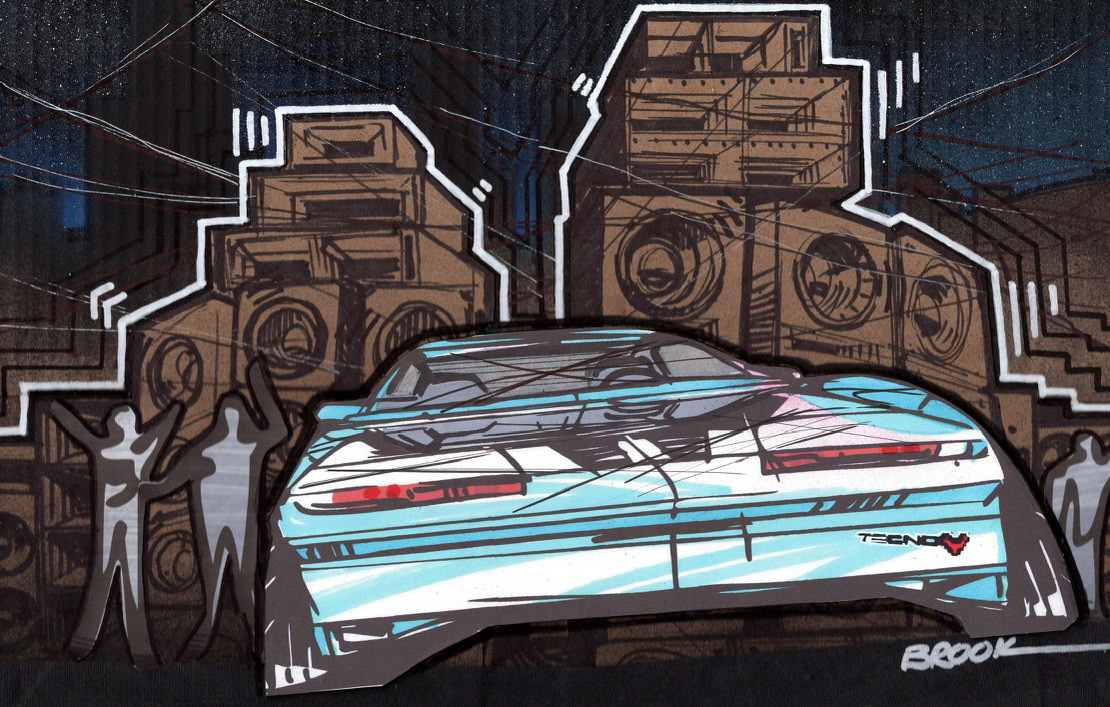 A '91 Firebird, a midnight ghost of Detroit's past, with speakers like decaying city infrastructure, where lines still feed towers with power and audio with life. 11x17 collage of hand drawings on reused Amazon cardboard boxes.
