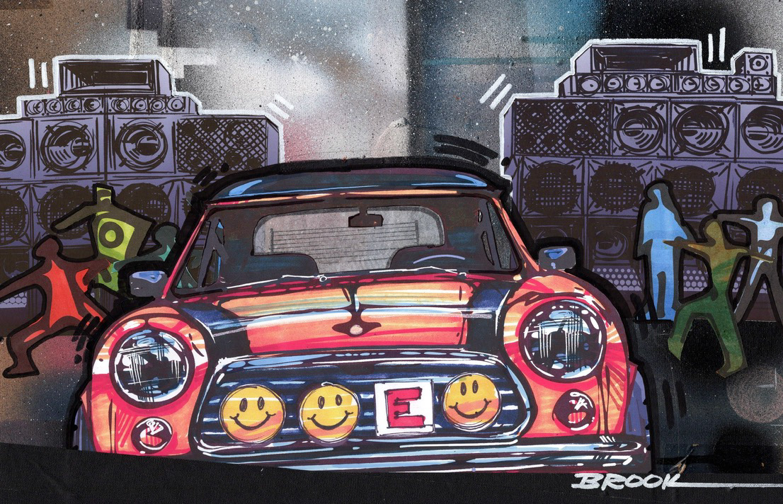 Brook’s first car was an orange-and-black Austin Mini, and the image is set against the backdrop of the 1993 UK rave scene. He was drawn to underground Spiral Tribe–style gatherings — outdoor parties under railway bridges, in wooded copses, and open fields around Milton Keynes, Coventry, and Suffolk. The raw, DIY energy of those sound systems became a lasting influence.